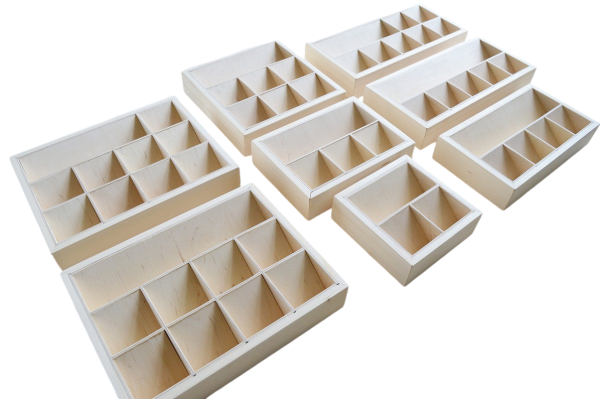 W skład zestawu wchodzi 8 pudełek różnej wielkości. Najmniejsza osobna przegródka w pudełku mieści kartę o wymiarach: 6 cm szerokości i 7 cm wysokości.