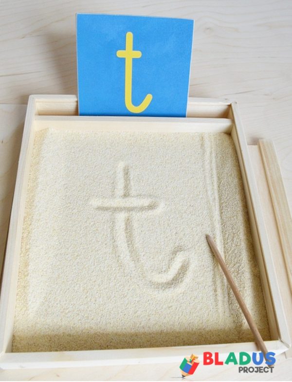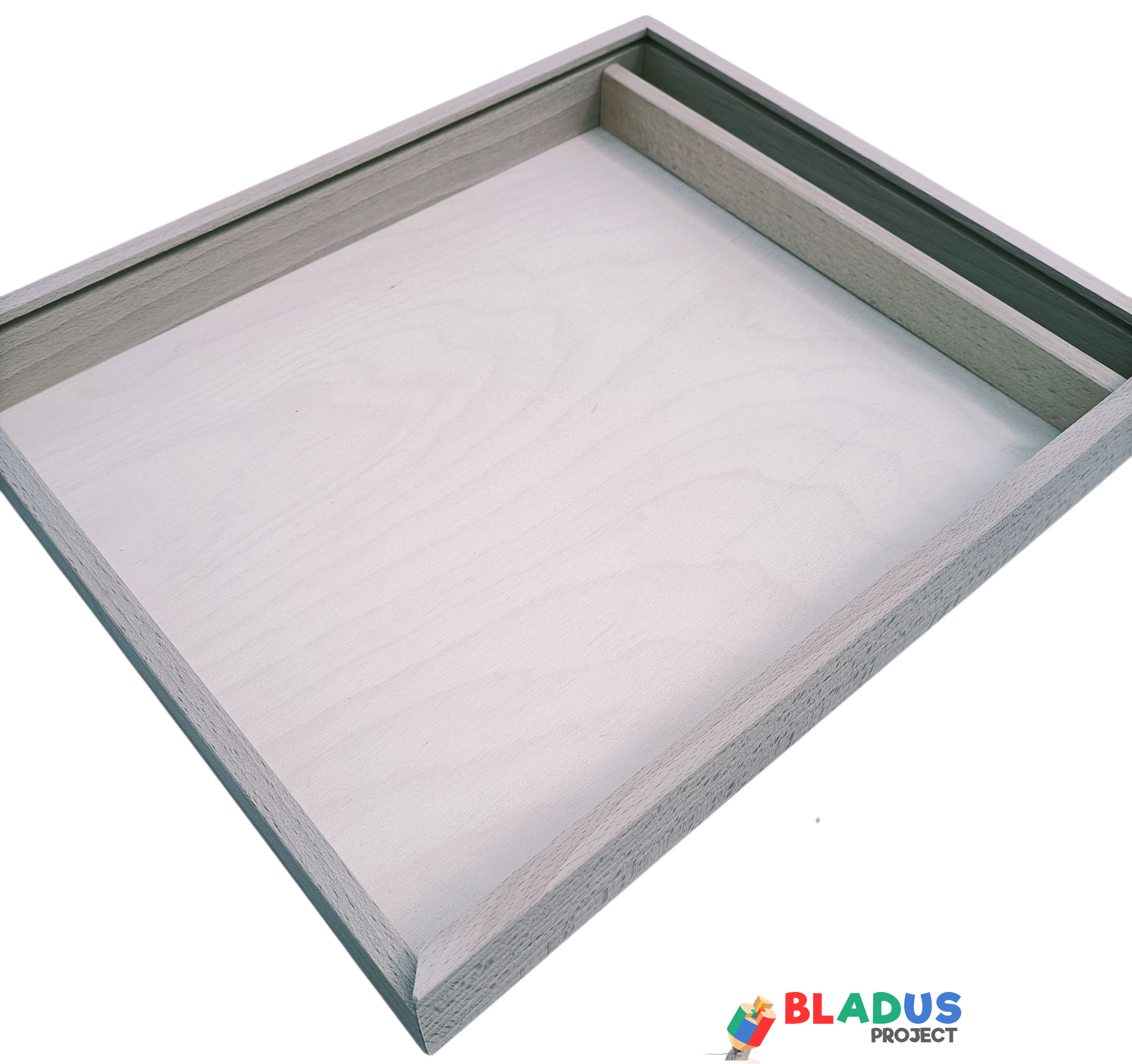 Pudełko do nauki pisania liter i cyfr z miejscem na materiały sypkie.