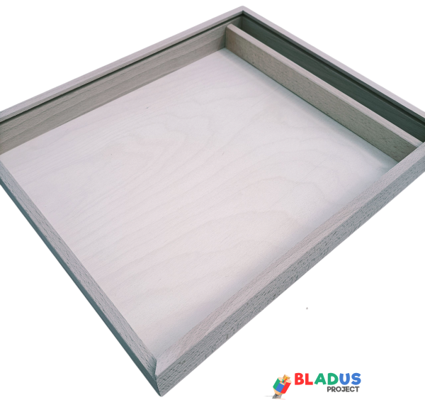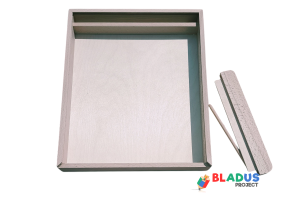 Pudełko pełni funkcję pomocy edukacyjnej do nauki pisania liter i cyfr w materiałach sypkich takich jak np. piasek, kasza, mąka.