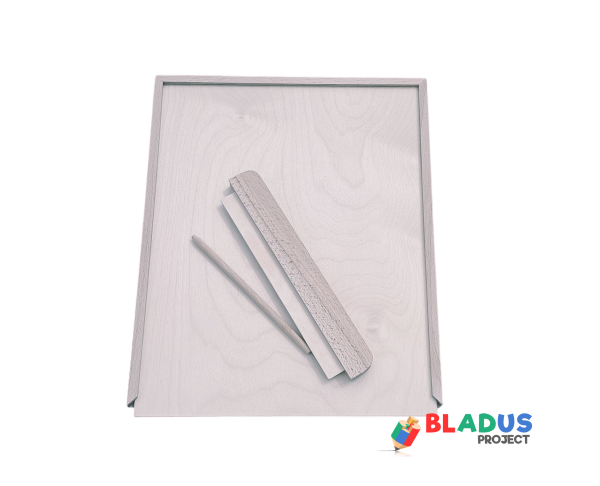 W zestawie dołączona jest również listwa wyrównująca wsypany materiał, dzięki której dziecko szybko może „zmazać” napisaną literę aby tworzyć nową. Całość jest zamykana.
